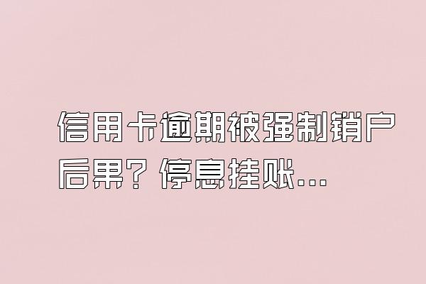 摘要:信用卡逾期被强制销户后果?停息挂账银行会同意吗?信用卡作为一种便捷的支付工具,可以帮助人们快速解决消费问题。然而,如果不慎逾期,后果可能非常严重。本文将探讨信用卡逾期被强制销户的后果以及停息挂账的相关···